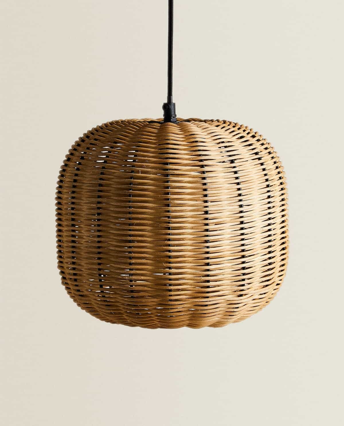 Runde Deckenlampe mit Metallfüßen und Rattanschirm. Glühbirne nicht im Lieferumfang enthalten. Empfohlene Glühbirne max. 25 W. Falls das Anschlusskabel oder Lampenkabel beschädigt wird, darf es nur von einem Fachmann ausgetauscht werden, um Risiken zu ver