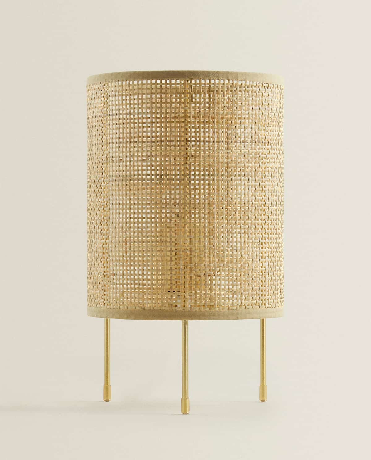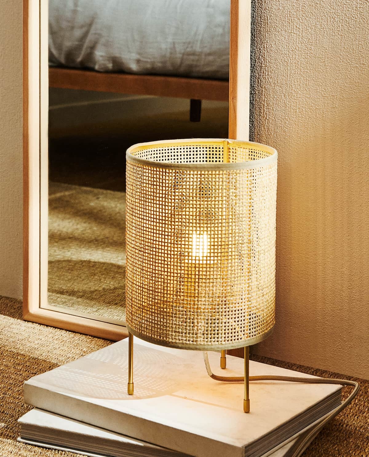 Tischlampe mit Metallfüßen und Rattanschirm. Glühbirne nicht im Lieferumfang enthalten. Empfohlene Glühbirne max. 40 W. Falls das Anschlusskabel oder Lampenkabel beschädigt wird, darf es nur von einem Fachmann ausgetauscht werden, um Risiken zu vermeiden.