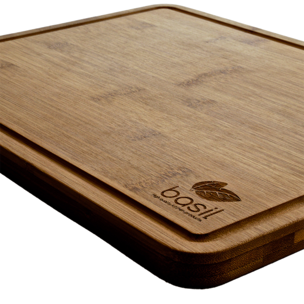 Durch die praktische Saftrille auf der Vorderseite dient das Schneidebrett zum Einen als Tranchierbrett. Durch einfach